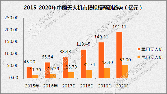 根据中商产业研究院发布的《2017-2022年中国无人机市场发展前景及投资机会分析报告》数据显示,2015年中国民用无人机市场销售规模达到11.3亿元。随着无人机应用领域的逐渐扩大,无人机市场需求逐渐提升,预计2017年中国民用无人机市场规模将达到23.73亿元。2017年中国军用无人机市场规模将达到88.48亿元,未来将保持持续稳定增长。预计到2020年中国民用无人机市场将达53亿元,军用无人机将达191.11亿元,中国无人机市场总规模将超200亿元。